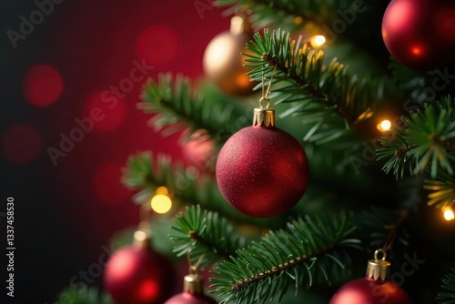 Close-up of a richly decorated Christmas tree; focus on red stars , christmas lights, shiny