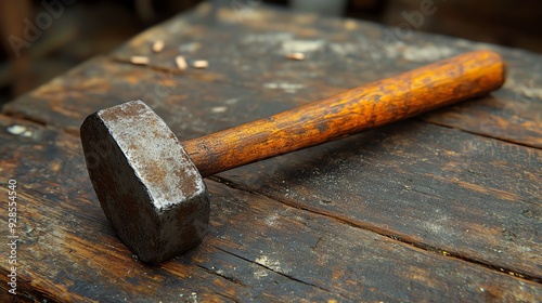Close-up of a rustic hammer resting on a wooden surface, showcasing its worn wooden handle and metallic head. Perfect for craft images.
