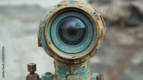 lens, optical, instrument, vintage, rust-eaten, antique, old, weathered, aged, metal, circular, round, detail, closeup, macro, texture, surface, sharpened, view, sight, gaze, perspective, glasses, camera, telescope, machinery, equipment, technology, science, exploration, discovery, observation, measurement, gauge, apparatus, device, tool, industrial, outdoors, nature, background, photo, image, picture, photo