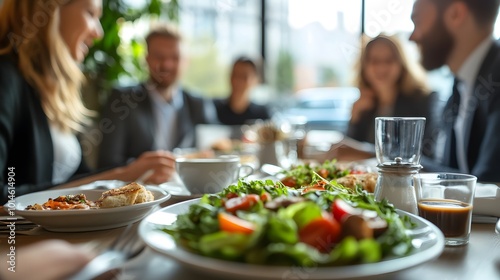 Close-up of a Salad and Coffee at a Table with Blurred People in the Background