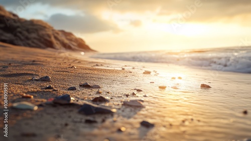 Close-up of a sandy beach with small rocks at the shoreline, with a golden sunrise and waves in the background.