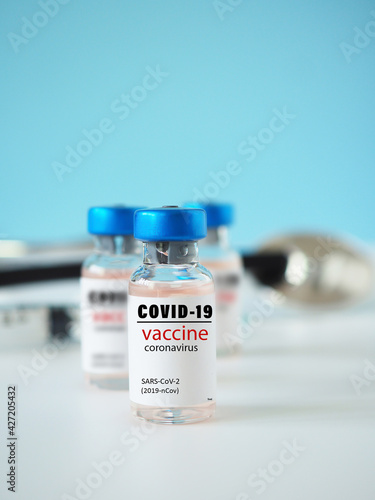 Close-up of a simulated Covid-19 vaccine in a vial for protective coronavirus on white background with a blue backdrop. Healthcare and medical concept.