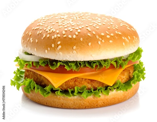 burger, hamburger, food, fast food, cheeseburger, sandwich, crispy, fresh, meat, patty, cheese, lettuce, tomatoes, onion, bun, sesame, yellow, brown, delicious, tasty, appetising, isolated, white, studio, image, lunch, dinner, snack, fast, simple