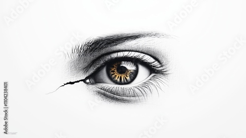 Close-up of a single human eye with detailed iris and eyebrow illustration on a white background, accompanied by a diagonal crack across the lower eyelid creating a surreal effect