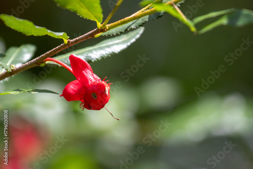 Close-up of a single vivid red persistent sepal of the Ochna (Ochna serrulata) hanging on a branch. Sharp focus isolates the unique shape against the blurred green background.