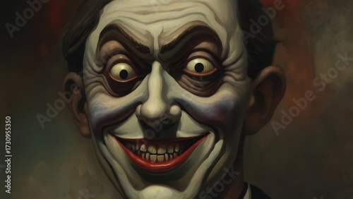 Close-up of a sinister clowns face with a wide, unsettling grin and piercing eyes, evoking a sense of dark humor and psychological unease.