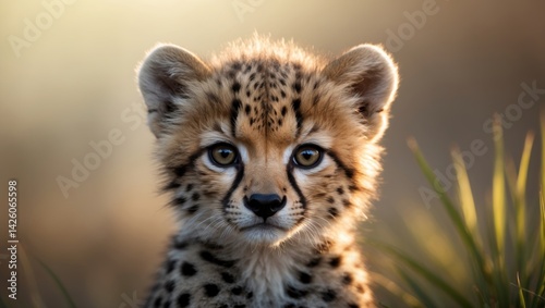 Close-up of a small cheetah cub with an adorable face gazing into the camera against a smooth background