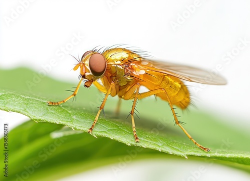 Close-up of a small, golden-yellow fly on a vibrant green leaf