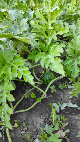 Close-up of a small watermelon developing on the vine, thriving in a natural and healthy agricultural environment