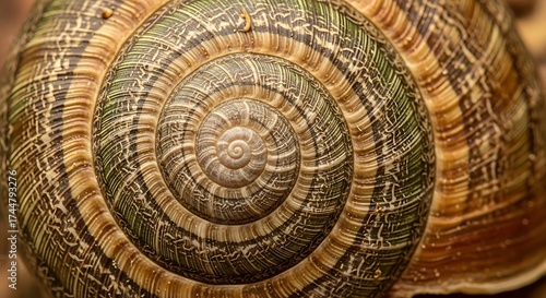 snail, shell, spiral, pattern, nature, texture, macro, closeup, animal, mollusc, gastropod, brown, green, detail, concentric, curve, natural, organic, wildlife, biology, zoology, growth, symmetry, abstract, background, surface, rough, ridged, coiled, circular, geometric, design, art, beauty, fragile, protection, home, habitat, garden, forest, outdoors, creature, small, earth, environment, ecosystem, life, evolution, structure