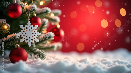 christmas, christmas, holiday, festive, celebration, tree, christmas tree, tree branch, firbranch, snow, snowy, white, frost, ice, ornament, bauble, snowflake, ornament, decoration, decor, light, bokeh, red background, soft focus, winter, season, greeting, card, invitation, cosy, warm, magical, sparkling, glowing, detail, closeup, macro, nature, evergreen