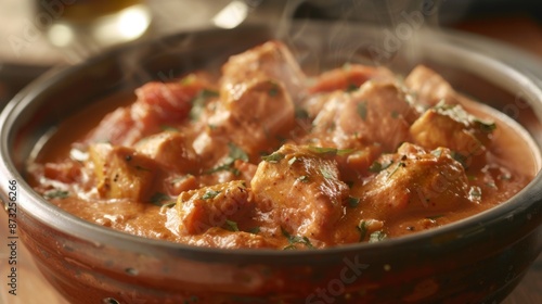 Close-up of a steaming bowl of spicy chicken tikka masala with creamy tomato sauce