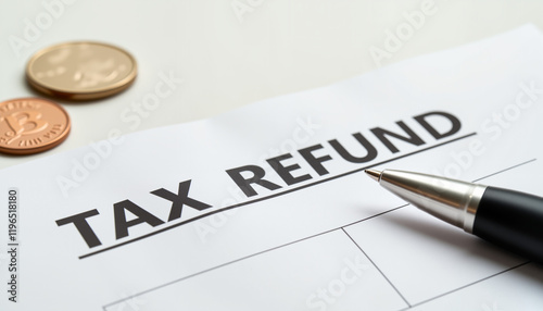Close-up of a tax refund form with "Refund" highlighted, accompanied by a pen and coins on a white desk