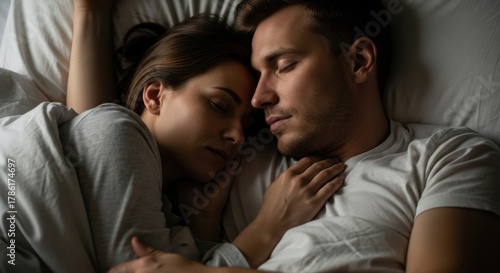 Close-up of a tender young couple peacefully sleeping and cuddling together in bed under soft light. Man and woman embracing, representing comfortable rest, intimacy, relationship, and sleep health.