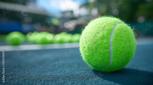 Close-up of a tennis ball with textured surface, vivid green fibers illuminated by bright light, multiple balls grouped dynamically, sports gear and background softly out of focus