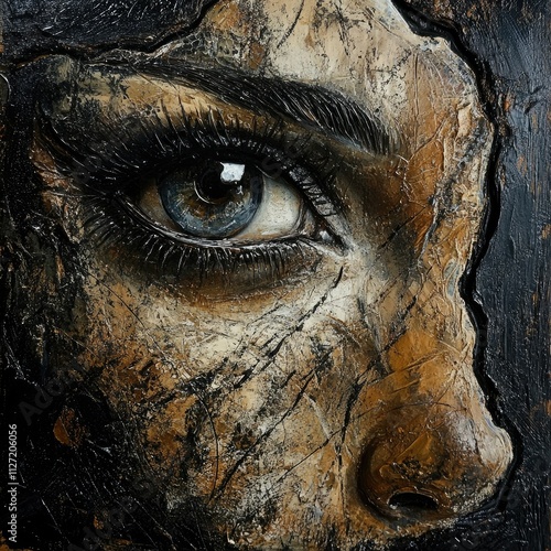 eye, woman, face, art, portrait, texture, sculpture, painting, brown, gold, black, detail, closeup, beauty, look, gaze, expression, emotion, artistic, creative, visual, abstract, style, design, image, illustration, artwork, masterpiece, realistic, intricate, elegant, sophisticated, dramatic, intense, mysterious, powerful, enigmatic, fascinating, captivating, alluring, tempting, seductive, sensual