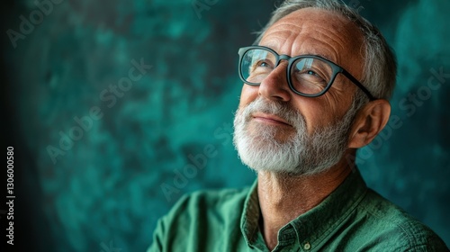 Close-up of a thoughtful senior man wearing glasses against a teal backdrop. Ideal for themes of reflection, wisdom, and aging gracefully.