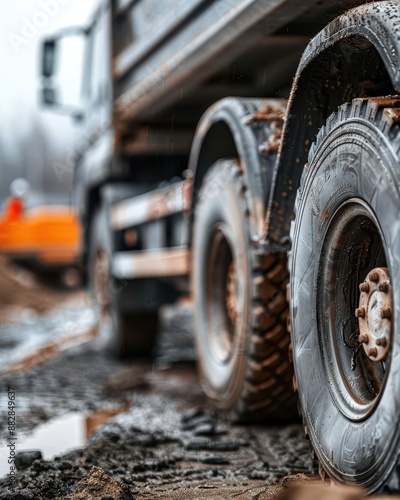 Close-up of a truck tire on a construction site.