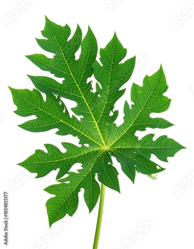 Close-up of a vibrant green leaf, showcasing intricate veins and a unique shape against a clean white background