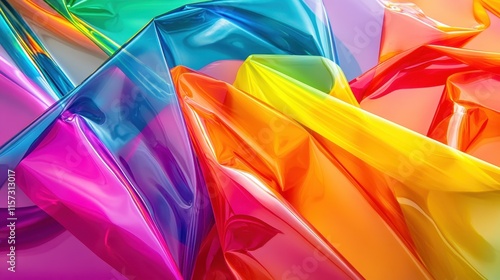 Close-up of a vibrant plastic polymer film, showcasing its smooth, glossy surface and rich colors, with intricate light reflections enhancing the visual appeal.