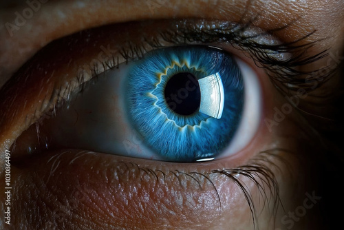 Close-up of a vivid blue eye showcasing intricate patterns and light reflections