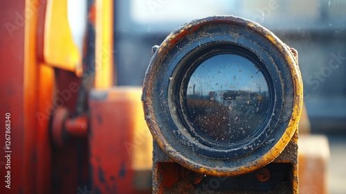Close-up of a weathered lens on heavy machinery, showcasing the textures of rust and dust, hinting at a hardworking industrial environment.