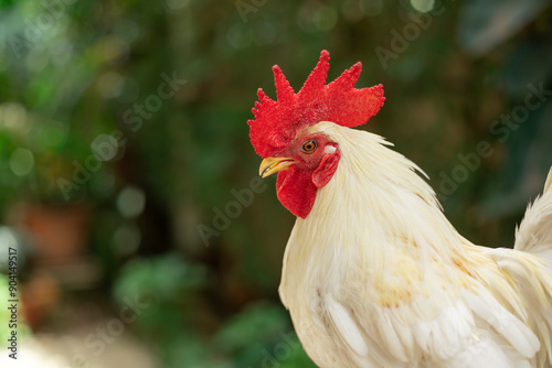 Close-up of a white chicken on an organic farming farm, poultry and livestock. Chickens, hens and free-range birds.