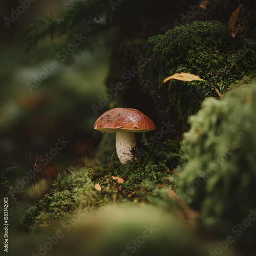 Close-Up of a Wild Mushroom Growing on Forest Floor Surrounded by Lush Green Moss and Foliage