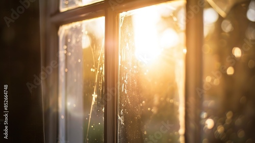 Close-up of a window at sunrise, bright rays piercing through, natural light, sharp details, macro shot, morning serenity.