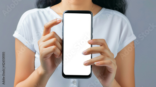 Close-up of a woman in a light shirt holding a smartphone with a blank white screen, ready for input or display, with another phone on the table.