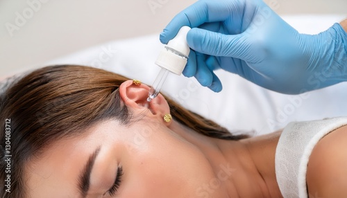 Close-up of a woman receiving ear drops in a clinical setting, showcasing healthcare procedures and patient care.