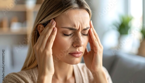 Close-up of a woman with blonde hair, eyes closed, and hands on temples, experiencing headache pain