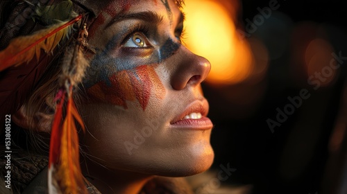 woman, tribal, face, paint, feather, leather, gaze, light, fire, expression, heritage, culture, strength, tradition, eye, intensity, costume, dramatic, spiritual, fierce, primal, warrior, ceremony, glowing, texture, realism, skin, authentic, identity, portrait, powerful, flames, ritual, beauty, indigenous, history, detailed, rustic, natural, timeless, earthy, survival, female, root, ethnic