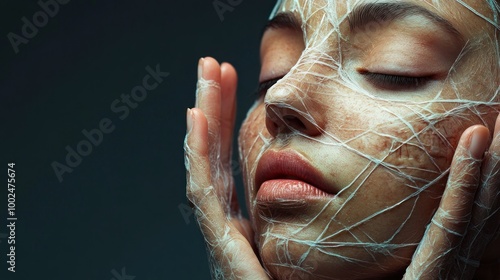 woman, face, skin, web, white, substance, detail, eye, closed, mouth, lip, finger, hand, texture, pattern, delicate, intricate, fine, line, abstract, art, surreal, photo, digital, illustration, beauty, fashion, style, graphic, design, dark, background, shadow, light, contrast, mood, mystery