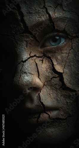 woman, face, cracked, earth, dry, texture, skin, aged, dryness, earthly, desolate, arid, rough, wrinkled, pale, dark, light, blue, eye, nose, mouth, shadow, contrast, portrait, closeup, detail, beauty, art, photo, dramatic, melancholy, fragile, severe, damaged, worn, stressed, desolation, suffering, environmental, crisis, nature