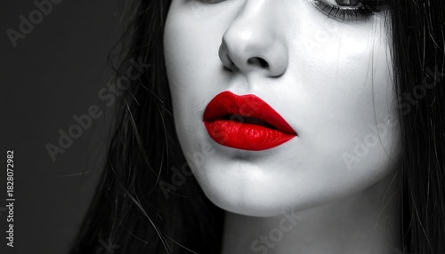 Close-up of a woman's face, selectively colored with vibrant red lips against a monochrome background