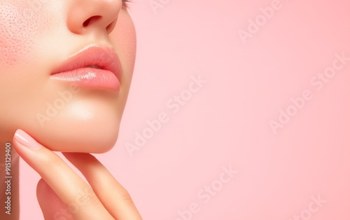 Close-up of a woman's face with soft, glowing skin against a pink background. Her hand rests gently on her chin.