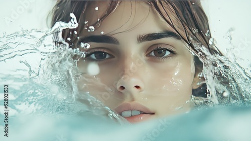 face, woman, female, water, splash, spray, eye, brown, hair, closeup, portrait, model, beauty, wet, skin, lip, mouth, fresh, clear, clean, cool, summer, pool, ocean, spa, relaxation, natural, liquid, abstract, texture, pattern, light, bright, blue, water, turquoise, white, background, photo, image, illustration, digital, art, graphic, design, creative, concept, mood, emotion