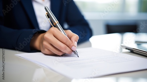 Close-up of a woman's hand signing a document. Bright office environment with enough space to put text on the side.