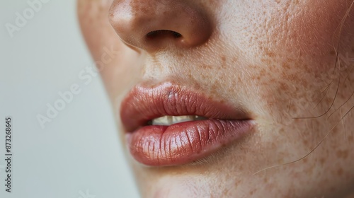 Close-up of a woman's lips and freckles, showcasing natural beauty and skin texture with soft lighting.