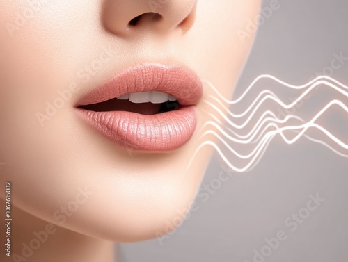 Close-up of a woman's lips as she emits sound waves, highlighting beauty and communication in a minimalistic style.