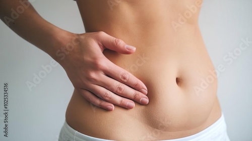 Close-up of a woman's waist and hand resting, showcasing a healthy body in a neutral setting.