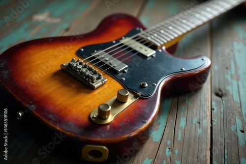 Close-up of a worn, vintage guitar with blues scales visible on the fretboard, resting on a weathered wooden surface , harmony, musical