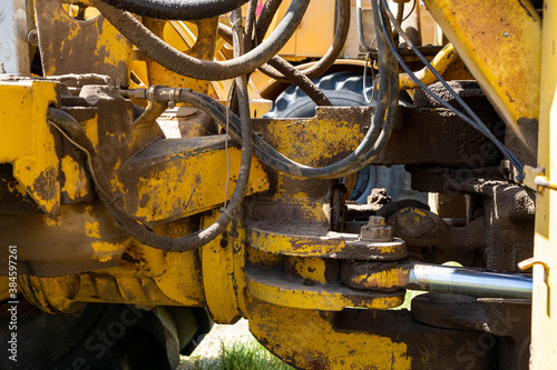 metal, bulldozer, industrial, wheel, steel, work, technology, industry, machine, diesel, russian, transportation, old, vehicle, hydraulic, power, heavy, ground, mover, building, construction, dirty, russia, bulldoze, contemporary, manipulator, machinery, yellow, caterpillar, scrap, truck, grass, hill, engine, rusted, motor, big, nature, terrain, cloudy, powerful, rust, day, tree, cabin, carriage, natural, engineering, dirt, strength