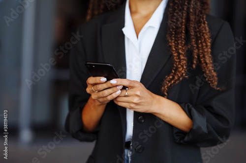 Closeup of a young businesswoman texting with her mobile phone wearing a medical mask. Beautiful girl chatting on the smartphone outside the office. Covid-19 business concept.