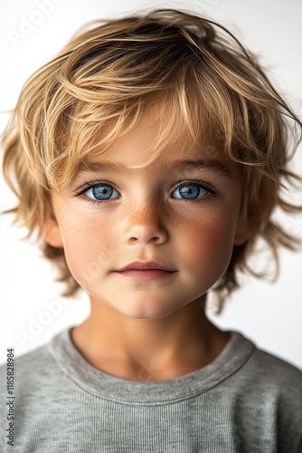 Close-up of a young child with bright blue eyes and tousled blond hair, exuding innocence and curiosity.