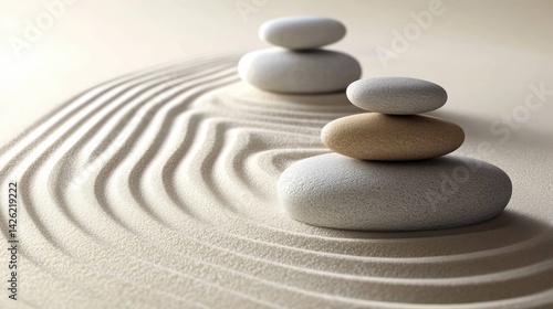 Close-up of a Zen garden with carefully placed stones and intricate raked sand patterns, exuding peace, tranquility, and a sense of meditation.