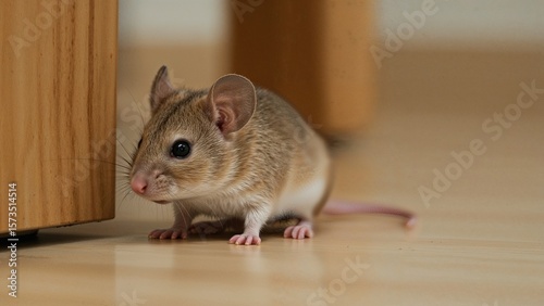 mouse, small animal, wildlife, living room, wooden floor, animal portrait, adorable, pink nose, blurred background, texture, natural light, critter, home interior, warm tones, still life, whimsical