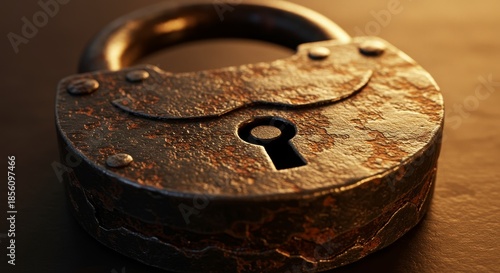 Close-up of an antique rusty padlock with cracked and corroded metal surface, illuminated by warm directional light, symbolizing security and age.