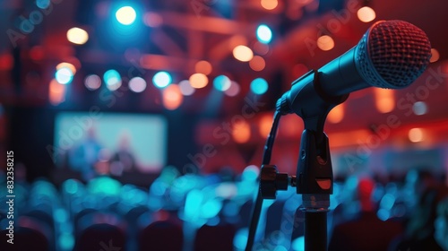 Close-up of an AR application being used to translate live speeches in an international conference, illustrator style, subtitles floating over the speaker,